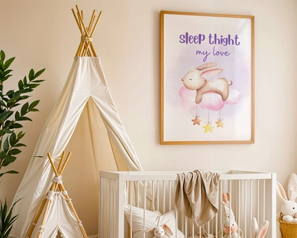 Plakat Króliczek Śpiący na Chmurce w Ramce 42x30 cm – Urocza Dekoracja do Pokoju Niemowlaka | A3 z Drewnianą Ramką