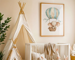 Plakat Słonik w Balonie z Proporczykami – Dekoracja do Pokoju Dziecka A3 | Ramka z Jasnego Drewna