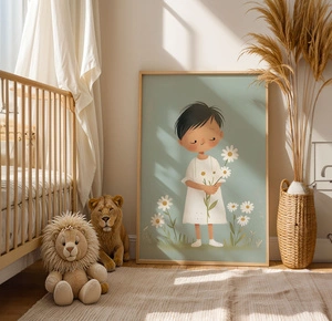 Plakat Chłopiec z Kwiatkami 42x30 cm – Dekoracja do Pokoju Dziecka | Ramka Drewniana A3