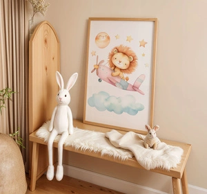 Plakat dla Dzieci w Ramce 42x30 cm – Lew w Samolocie | Dekoracja do Pokoju Malucha