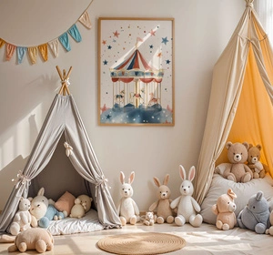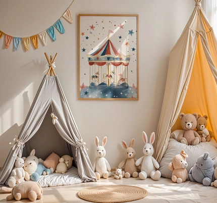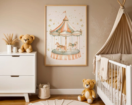 Plakat Karuzela w Ramce 42x30 cm – Magiczna Dekoracja do Pokoju Dziecka | A3 z Drewnianą Ramką