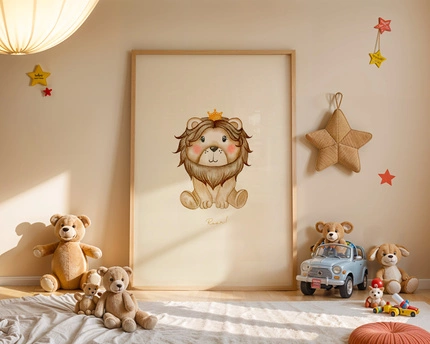 Plakat Lew w Koronie 42x30 cm – Dekoracja do Pokoju Malucha | Format A3 z Drewnianą Ramką